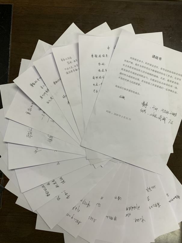 疫情就是命令,防控就是责任。新冠肺炎疫情形势严峻,但中心疾控工作者充分发扬若有战召必行的昂扬斗志,纷纷写下请战书。不到10分钟的时间,收到26名同志递交的请战书。罗水斌在请战书中写道:我工作32年,一直“战斗”在传染病检测这个没有硝烟的战场上,经验丰富,我申请去。新婚才一个月的邓凯元这样说道:疫情发生以来,我一直从事新冠病毒核酸检测,我有经验,我申请到武汉支援。余华则说:我是一名有24年党龄和10余年疾病预防控制工作经验的党员,面对疾病的肆虐,我申请加入支援武汉,请组织相信我……他们这群人里有60后的老党员,有年轻的妈妈,有新婚的丈夫,也有父母的宝贝儿女,他们有着不同的身份,但这一刻他们的身份都一样——勇敢的抗疫战士。