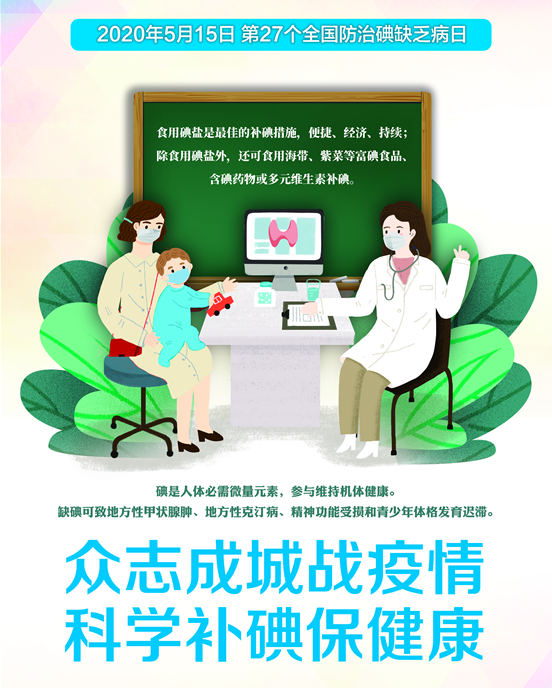 2020年5月15日是第27个“防治碘缺乏病日”,今年的宣传主题是“众志成城战疫情,科学补碘保健康”,当下,新冠肺炎疫情呈现稳步向好态势,公众在战“疫”的同时也要做好科学补碘工作,增强对食盐加碘防治碘缺乏病工作的认同和支持,有效保护了人民群众生命健康。