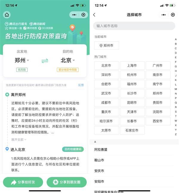 在这个小程序中,只需输入出发地、目的地,就能看到风险等级、具体建议,可以说非常全面实用了。
