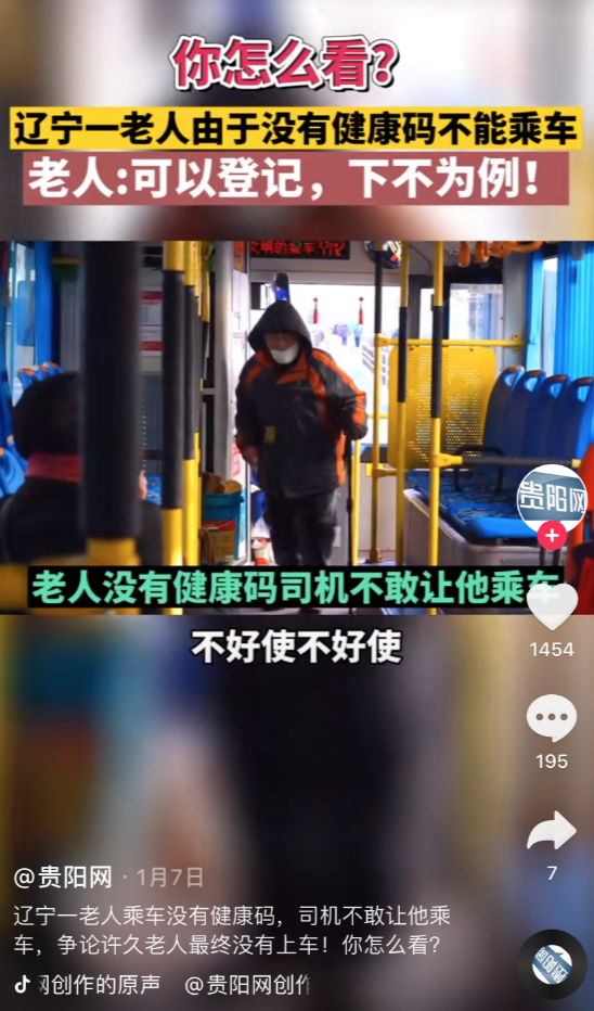 近日,某地一位老人因为没有健康码,上不了公交车的视频在网络平台传播。