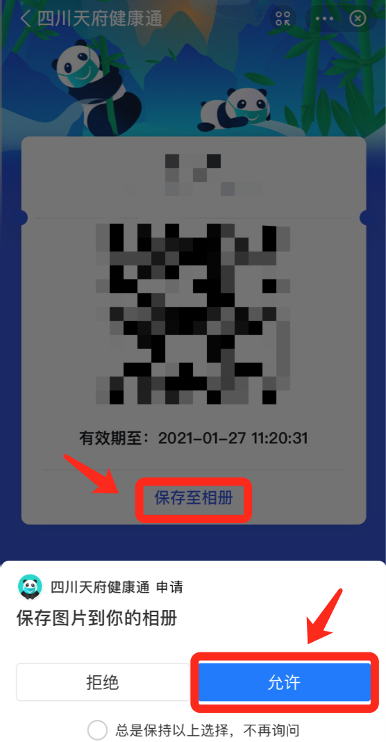 在健康码下方,点击“下载离线码”,并“保存至相册”。当提示您“保存图片或视频到您的相册”,请点击允许,即可下载使用。