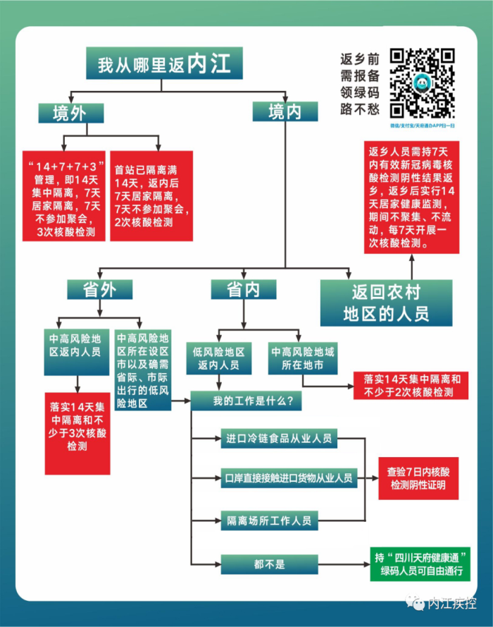 8.返乡人员可在出发地或目的地的任意一家有核酸检测资质的医疗机构进行检测,具备核酸检测机构资质可关注“健康内江”官方微信公众号查询。