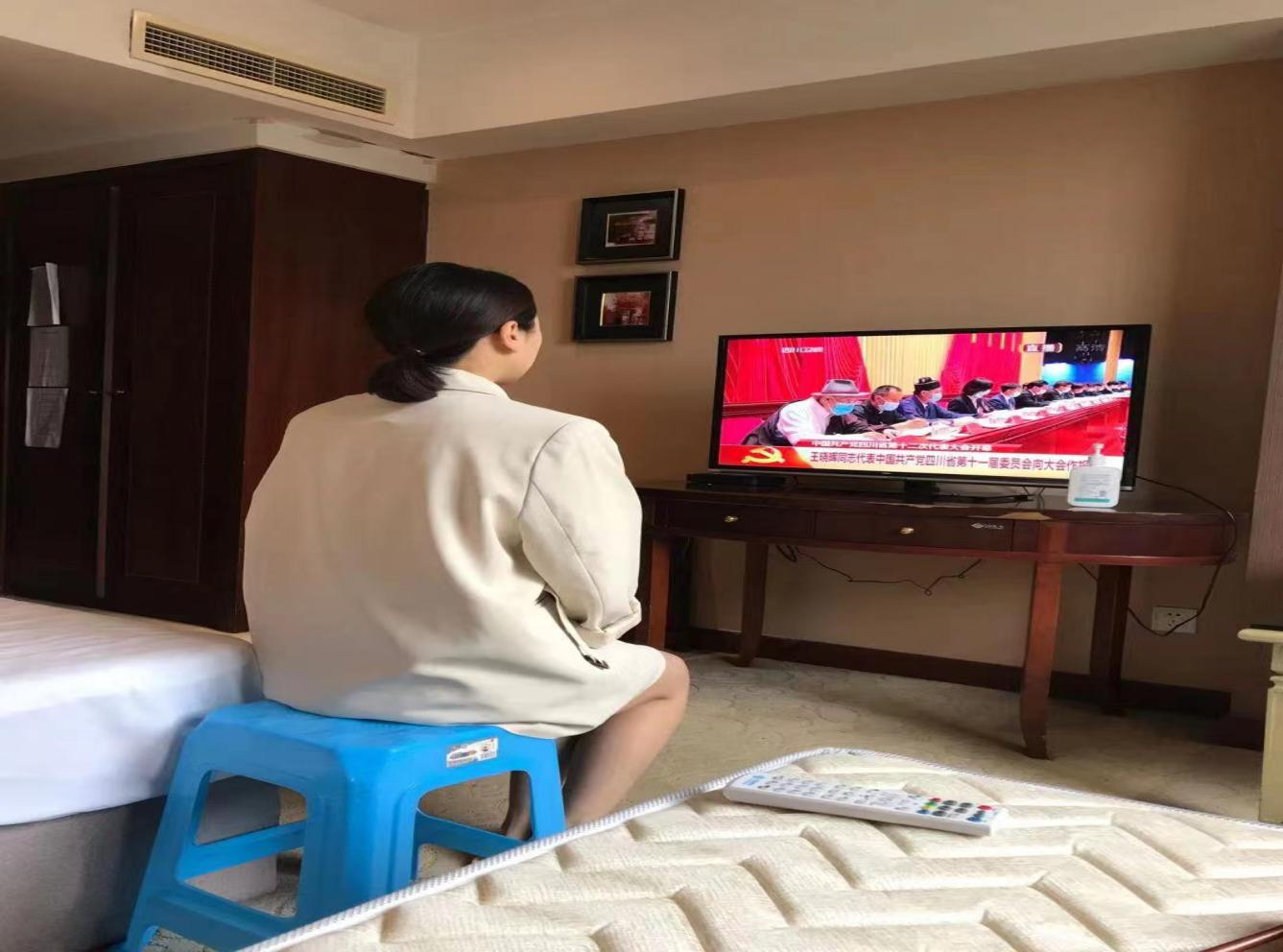 内江市疾控中心援邻人员在隔离酒店收看四川省第十二次党代会开幕式