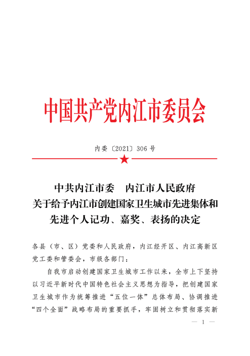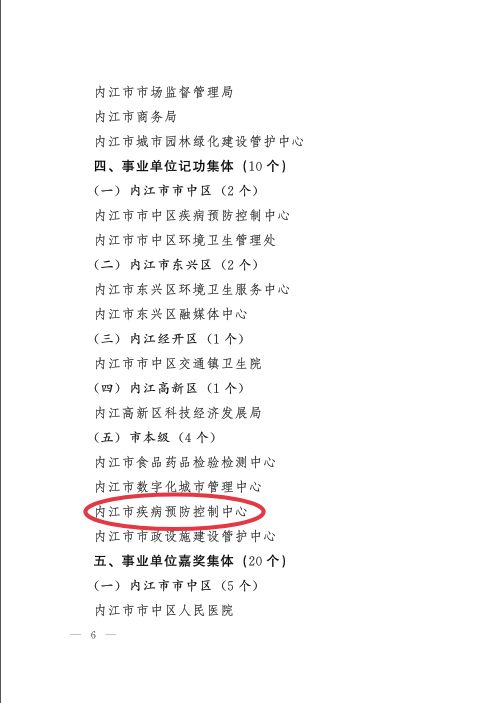 2021年7月,在中共内江市市委、内江市人民政府《关于给予内江市创建国家卫生城市先进集团和先进个人记功、嘉奖、表扬的决定》(内委〔2021〕306号)中,内江市疾病预防控制中心获“事业单位记功集体”,市疾控中心艾璟同志获“事业单位记功个人”,刘鹃同志获“事业单位嘉奖个人”。