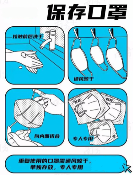 四是需重复使用的口罩在不使用时宜悬挂于清洁、干燥、通风处;
