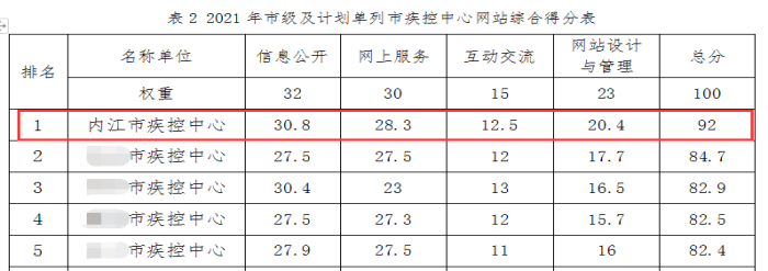 近日,省疾控中心公布了2021年全省各市(州)疾控中心门户网站评测结果,内江市疾控中心以92分的高分荣获第一名,高出第二名7.3分,超过全省评测平均分14.75分,遥遥领先!