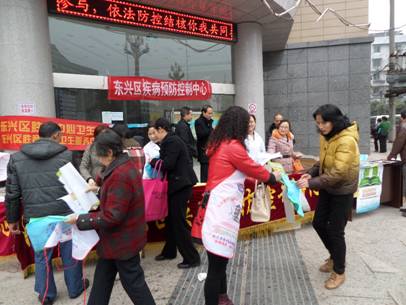 经过积极组织、精心准备,3月24日上午9:00—12:00区疾控中心组织区人民医院、东兴、西林、胜利社区卫生服务中心医务人员在东兴区疾控中心外开展了“3.24世界结核病防治日”宣传活动。同时各乡镇、社区卫生院在所在场镇设立宣传咨询点,积极开展结核病防治宣传咨询活动。经统计:全区共设宣传咨询点27个,挂标语27条,发放宣传资料15000余份,发放宣传品(环保袋子)各500个,接受咨询1500余人次,参加宣传咨询人员60余人,开展不同类人群结核病防治知识知晓率调查80人。医务人员在宣传活动中精神饱满、热情服务、有问必答,做到了耐心细致,内容涉及到相关政策、法规、防治知识、就医等多方面的问题,过往群众争相领取资料咨询,在获得结核病防治知识的同时也交口称赞政府在为广大患者办好事办实事。通过这次宣传活动,广大群众对结核病防治知识有所提高,特别是对免费治疗肺结核的政策有更进一步的了解。