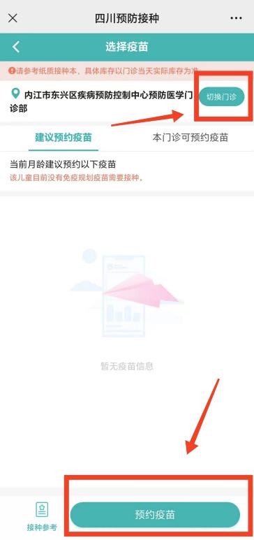 若“门诊可预约疫苗”显示“暂无疫苗信息”或者“当前门诊没有查到所需的疫苗”,则说明该接种门诊未开通预约或者无实物库存,可以联系该门诊进行咨询,或者点击右上角“切换门诊”更换到其它接种门诊进行查询预约。