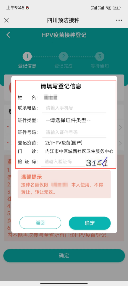 ①绑定成功后,返回首页,点击“HPV疫苗登记”开始预约,其他疫苗点击“疫苗预约”。②选择疫苗种类和接种单位。③在登记页面填写个人信息。