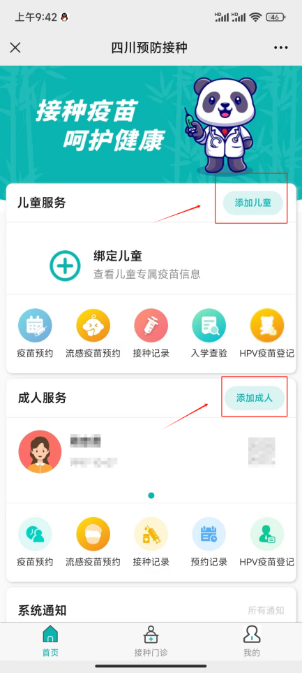 进入公众号页面后,点击底部“预防接种”按钮,进入首页。在“添加成人”版块进行信息绑定。